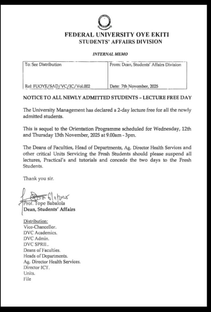 The management of The Federal University Oye-Ekiti (FUOYE) has declared a two-day lecture free for all newly admitted students.